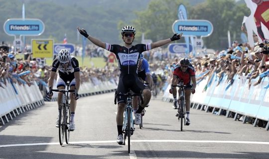 The Polish rider was chasing down Jack Bauer (Garmin-Sharp) and Albert Timmer (Giant-Shimano), who had a very small gap over a small chase group inside the final kilometer. Timmer was the remaining rider from an original breakaway, while Bauer had bridged to Timmer in the final kilometers as the gap was minimal thanks to some very hard efforts by OPQS and other teams on the front of the peloton.