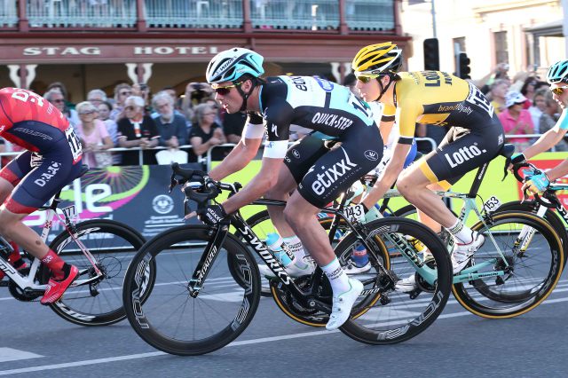 Etixx - Quick-Step rider Yves Lampaert went away with Manuel Quinziato (BMC Racing Team) and Bjorn Leukemans (Wanty - Groupe Gobert) at the top of Muur van Geraardsbergen, one of the several cobbled climbs of 188.6km Eneco Tour Stage 7 on Sunday, and managed a hard earned 3rd place in the stage. The trio stayed away until the finish line after going up the road with about 46km remaining.