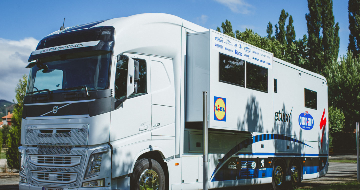 Etixx – Quick-Step's newest addition comes in the nick of time, just as the team is getting ready to start the final Grand Tour of the season (20 August-11 September). From now on, no matter how long, dusted or challenging the road to and back from races will be, life is going to be much sweeter to the riders, who will travel in our Volvo FH, a 460-horsepower truck with automatic gear box, which can be elevated in four directions: front, back, left and right.