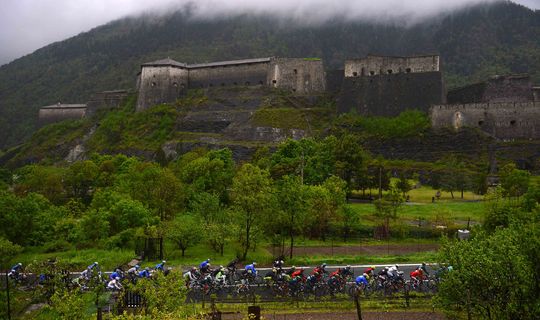 Omega Pharma - Quick-Step Cycling Team rider Matteo Trentin made a four rider escape group in a Giro d'Italia Stage 14 that featured such inclement weather the Sestriere climb was removed, which added 12km to make the stage 180km on Saturday.