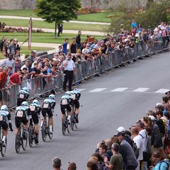 BMC Racing Team won by a single second over Team Sky with a time of 32 minutes and 15 seconds. Team Sky was fastest by 5" by the third checkpoint, but a 5th rider went into difficulty on Côte de Cadoudal (1.7km, 6.2%) into the finish. Movistar was in the hot seat before those teams crossed the finish line, and took 3rd (+4").