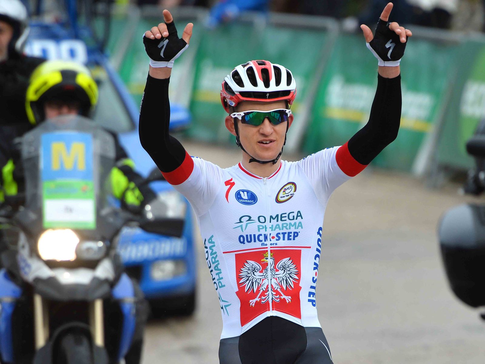 "I am really happy because my victory repaid the hard efforts of the teams in the first two races," Kwiatkowski said. "We didn't win, but we were always in the front and fighting. Today we didn't really control the race but we stayed the entire day at the front. Immediately after the start Vakoc went into the breakaway. The first two hours of racing were hard. But, Petr stayed in the first group and at that point we could take it easy behind. Then before Puig Major, Team Sky pulled to try and catch the breakaway. We stayed in the front with basically the whole team. When we started Puig Major we didn't really set the pace. We stayed on the wheels of the other teams. When Sergio Henao (Team Sky) attacked alone, Serry started to pull and the rest of the team helped him. After 7 kilometers of the climb I attacked and caught Henao. We then worked really well together and caught the breakaway at 7 kilometers to go. When we caught them, Vakoc did a great job for me. He basically helped me and I was able to launch my attack at about 6 kilometers to go on the false flat at the top of the climb. Then I went full gas on the descent. I know the descent really well, so for me it was an advantage. I arrived alone and it is super nice when you can raise your arms in the sky for the win. It's a great feeling and I am very happy about it."