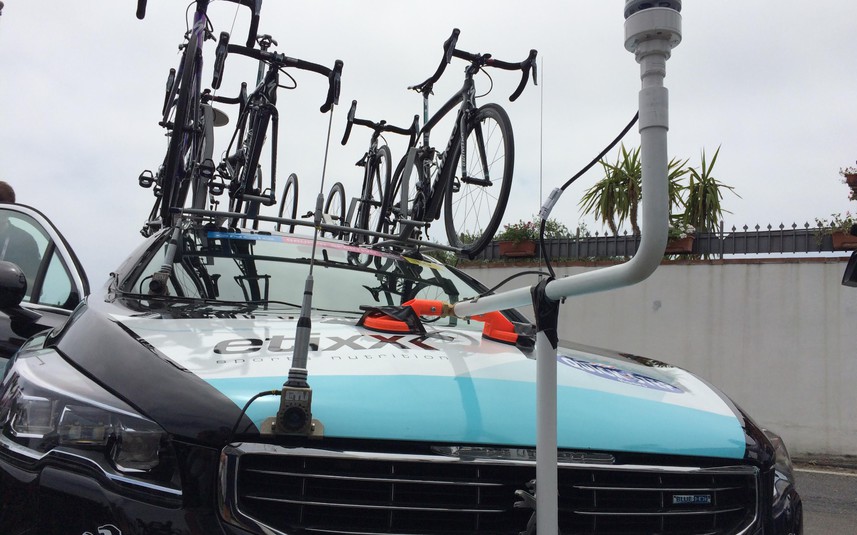 Photo: team car with ultrasonic multi-direction wind speed sensor mounted to hood.