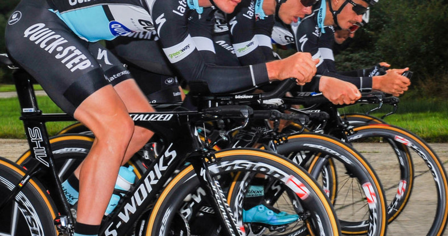 Yves Lampaert, Niki Terpstra, Rigoberto Uran, Tom Boonen, Tony Martin en Michal Kwiatkowski verdedigen de kleuren van Etixx – Quick-Step tijdens het wereldkampioenschap ploegentijdrit in Richmond, Virginia.
